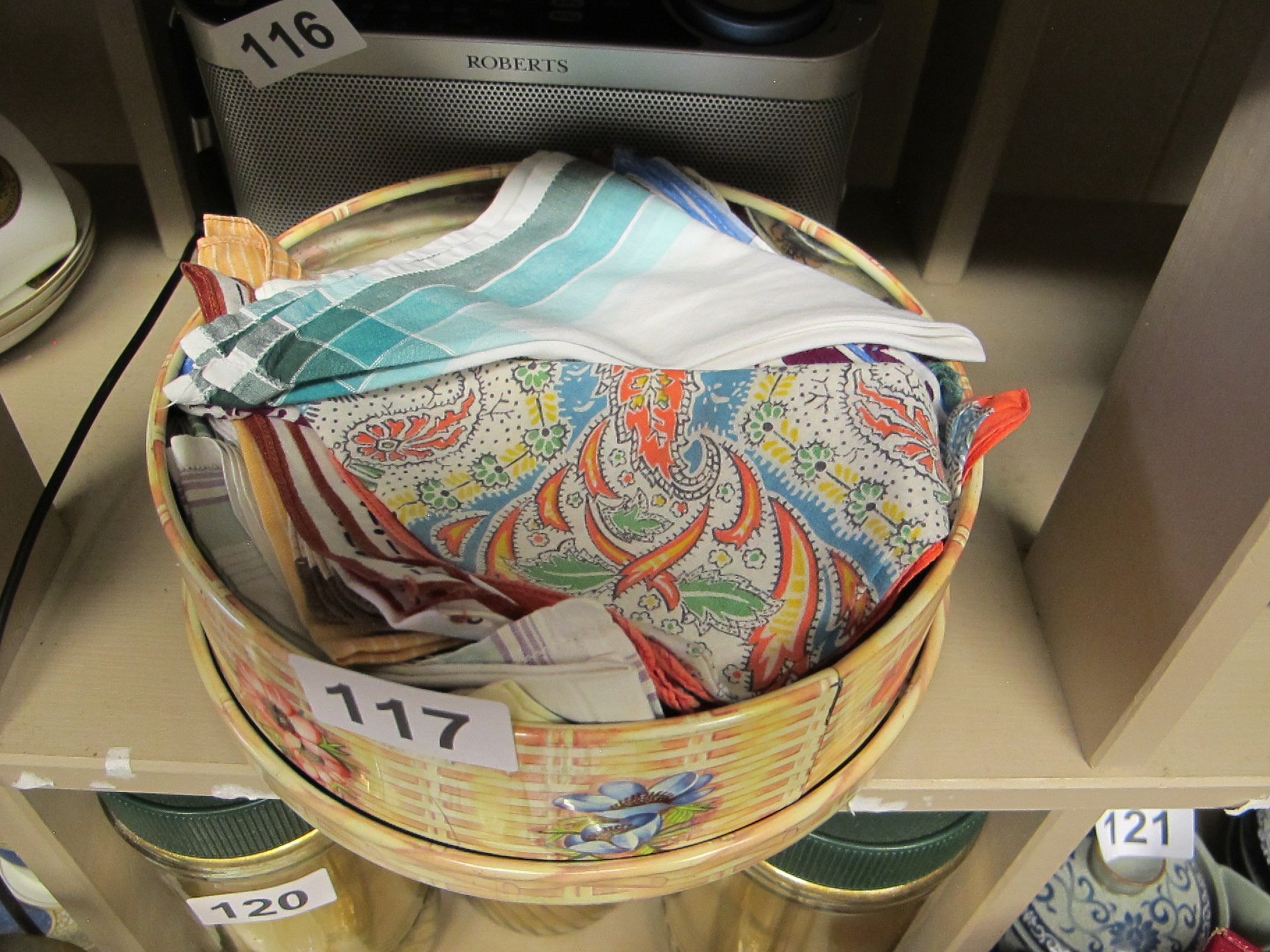 A Faux-Wicker Decorated Metal Tin with Assorted silk hankerchiefs