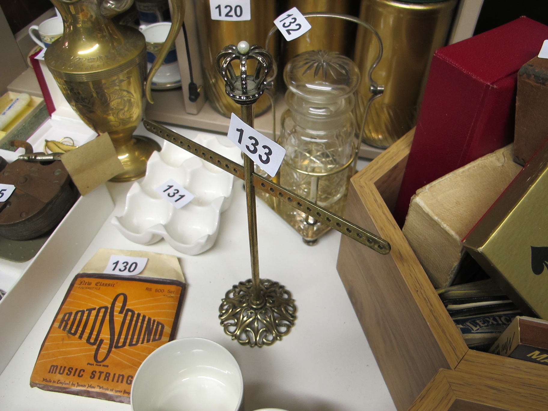 A decorative metal stand featuring an ornate foliate base, a slender column, and a jeweled crown finial topped with a pearl cabochon