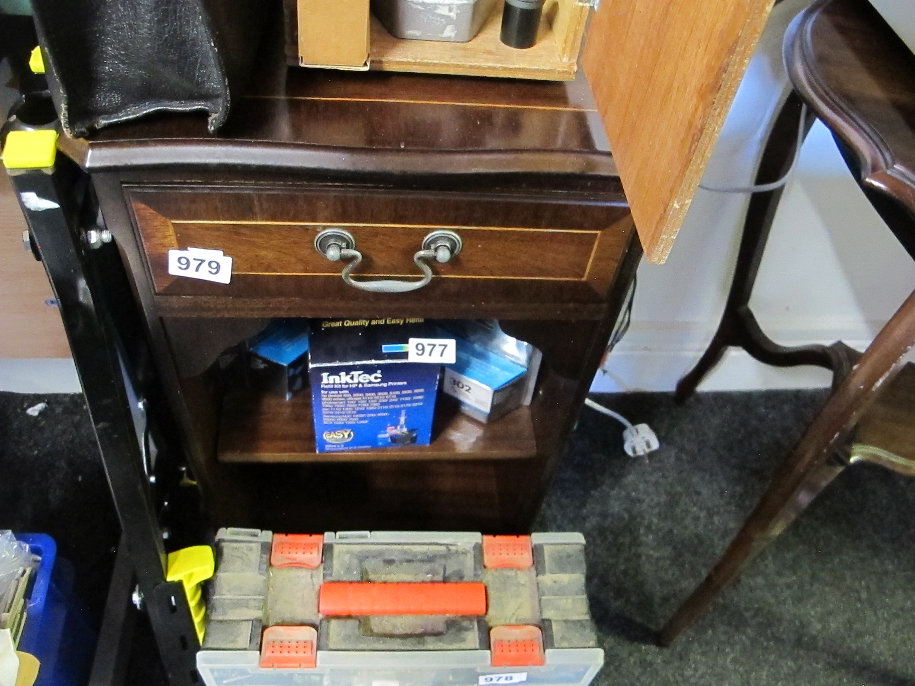 A Traditional-Style Dark-Stained Wood Side Cabinet with String Inlay