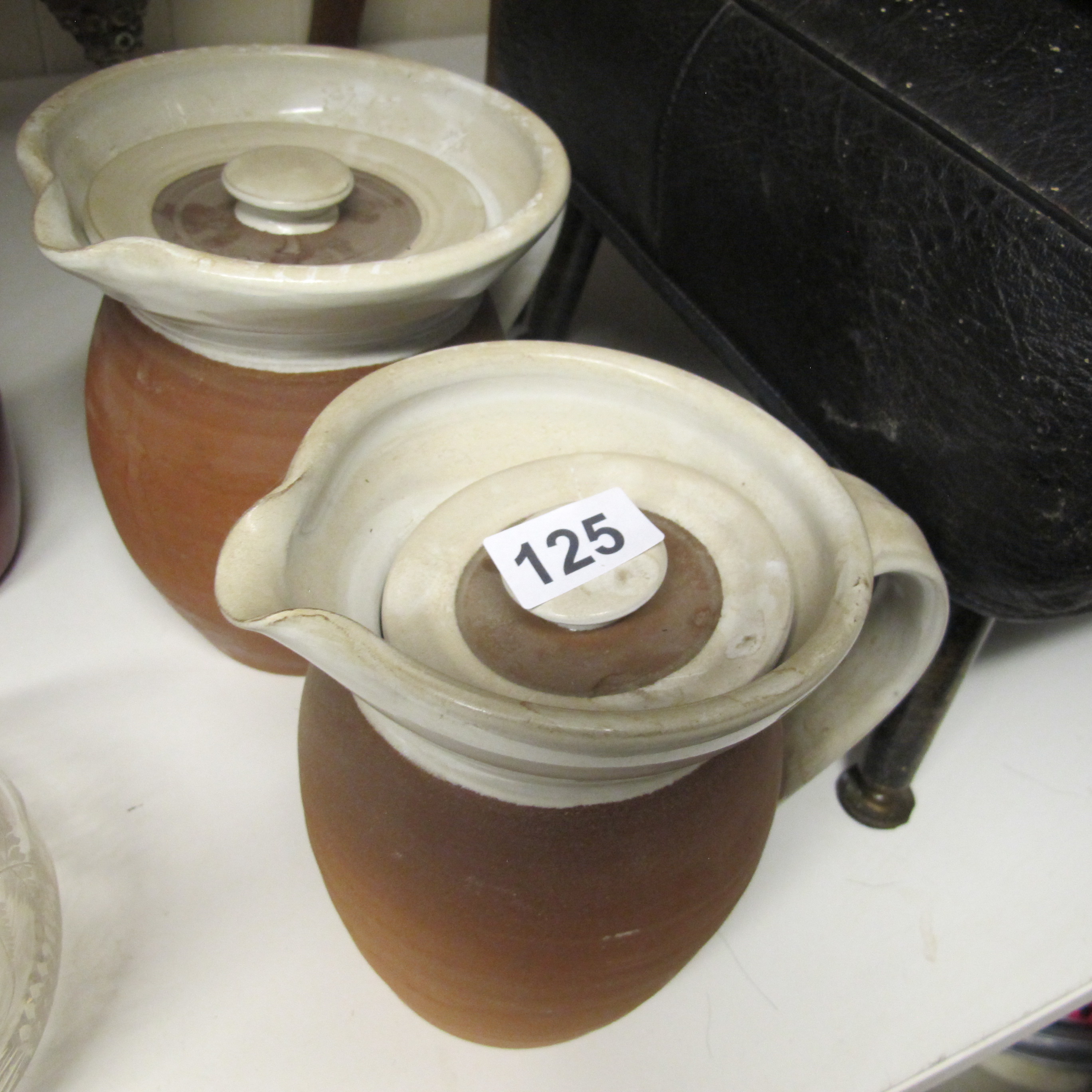 Pair of Vintage Two-Tone Stoneware Lidded Pitchers