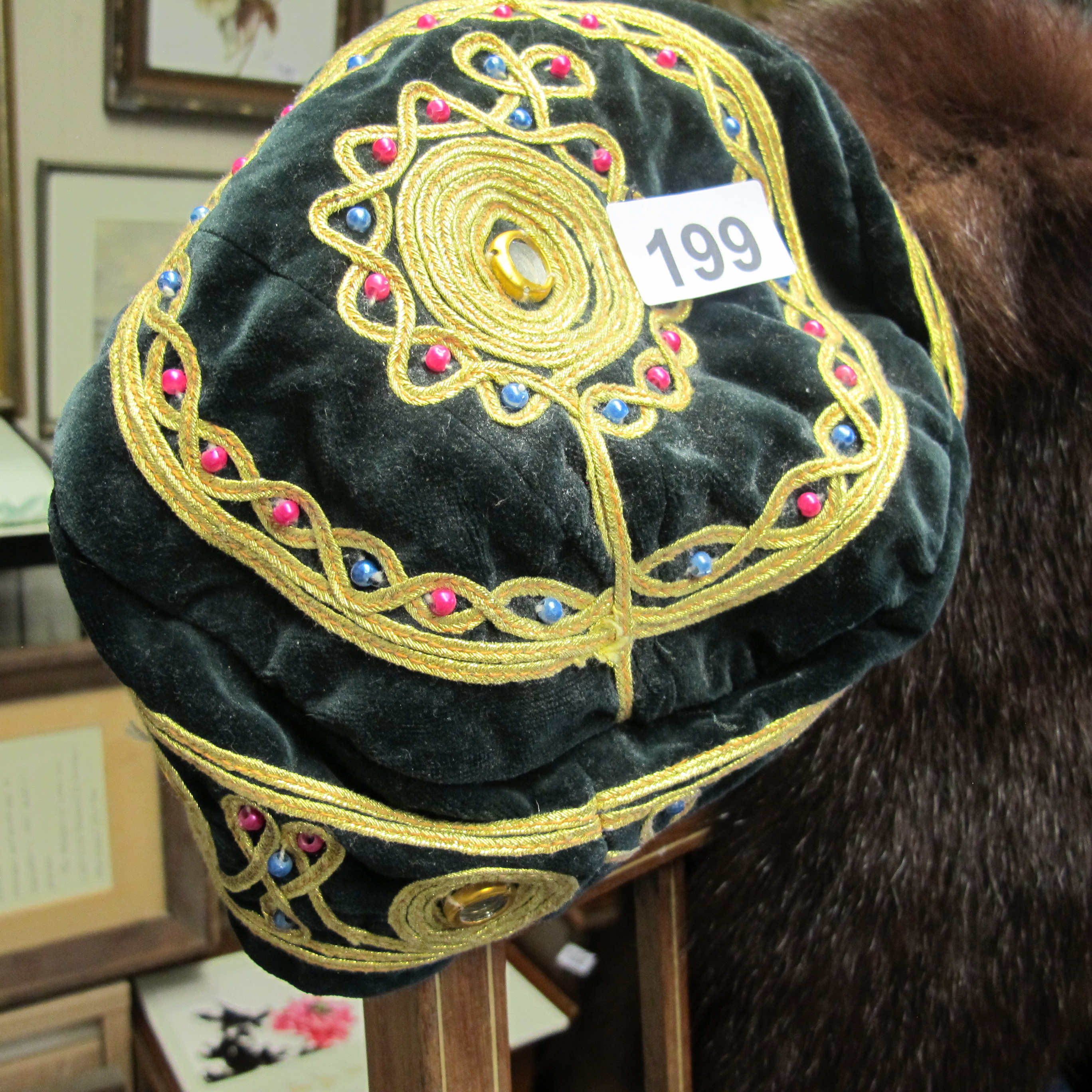 Traditional Velvet Embroidered Kufi Fez Cap with Gem-like Embellishment