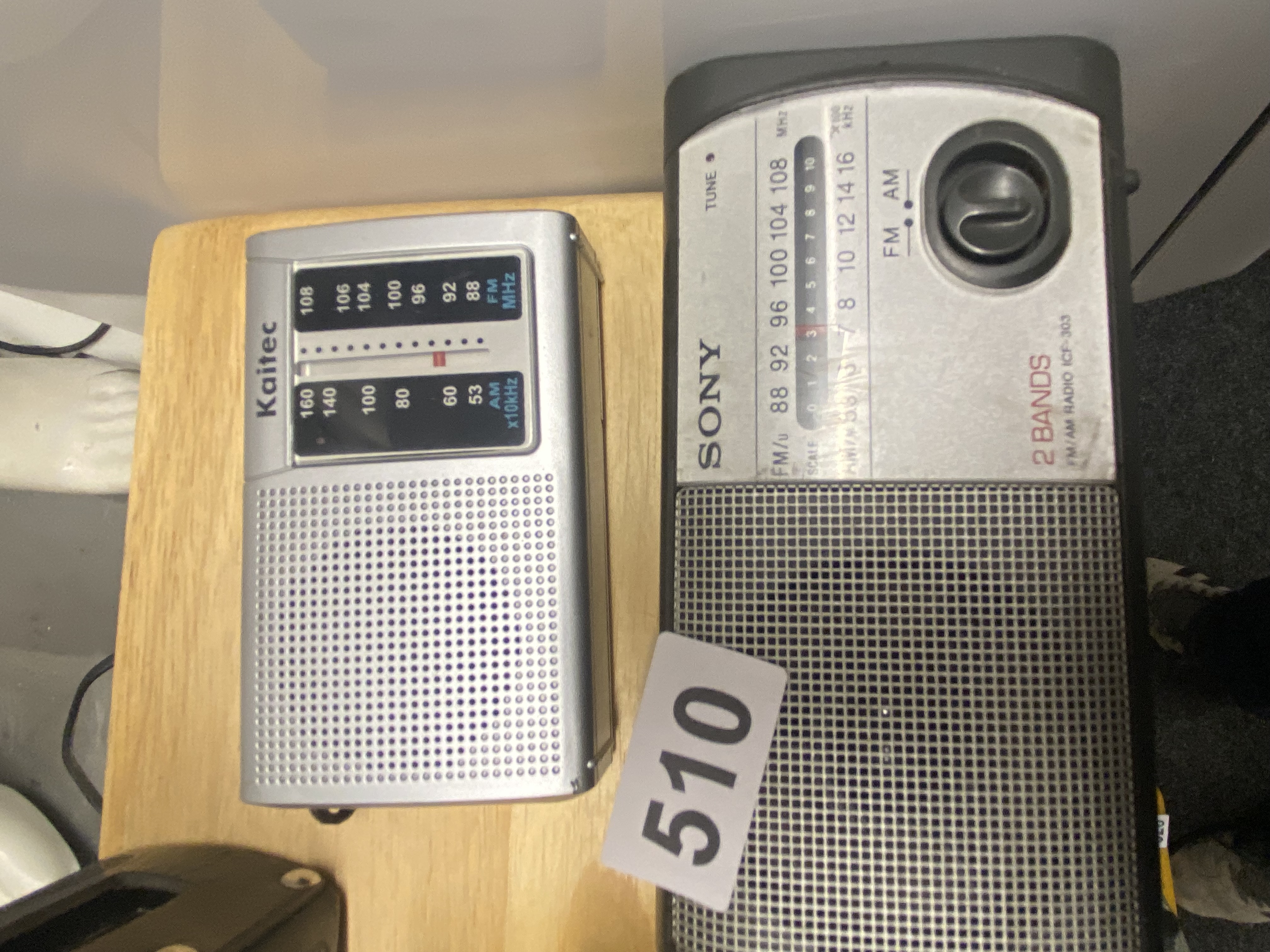 Two Portable Radios: A Sony ICF-303 FM/AM 2-Band and a Kaitec AM/FM Radio