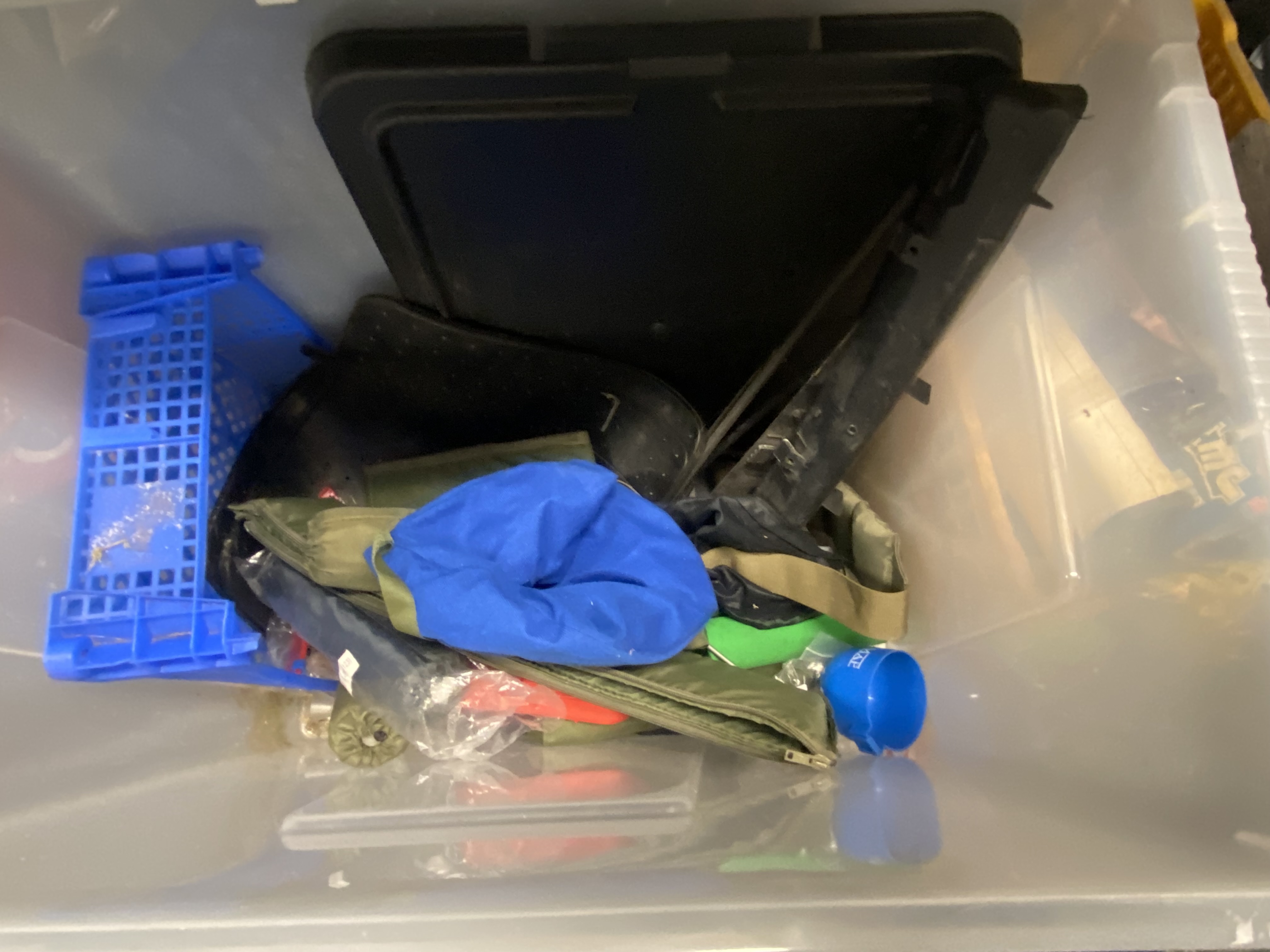 Assorted Utilitarian Items in a Plastic Storage Bin