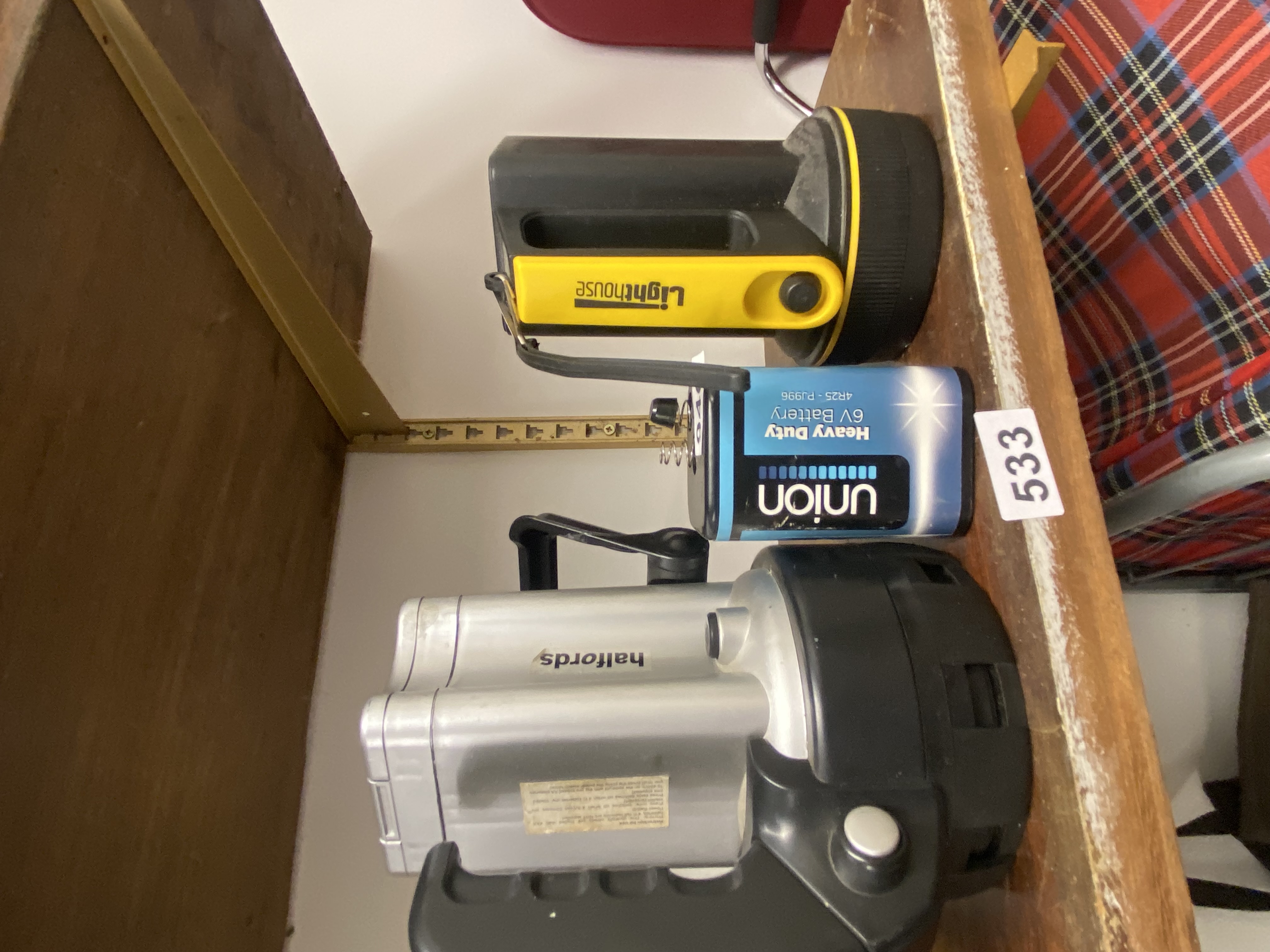 A Group of Three Modern Portable Electric Lanterns by Halfords and Lighthouse, with a Union 6V Battery
