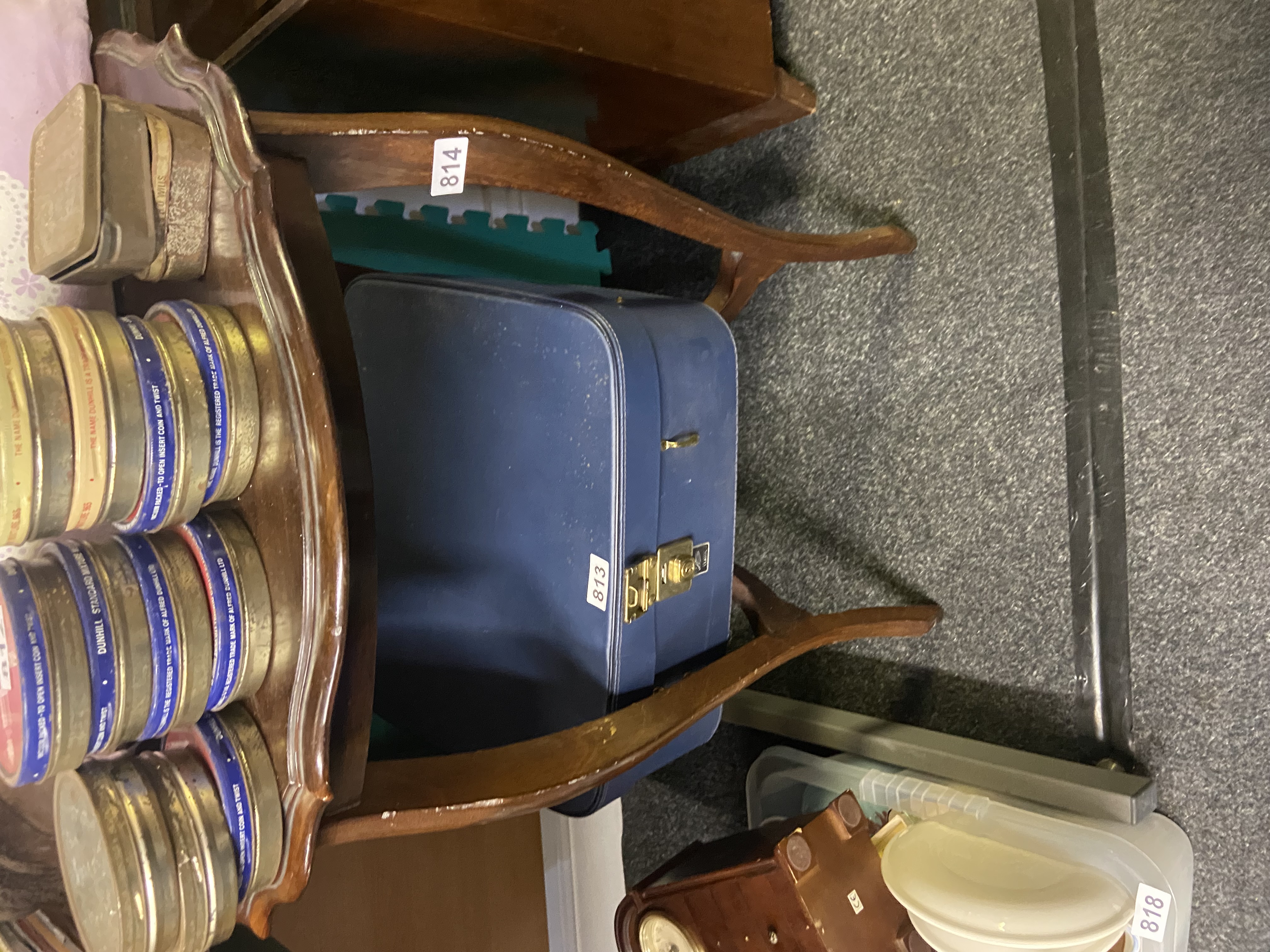 A Vintage Blue Suitcase with a Side Table and Assorted Metal Tins